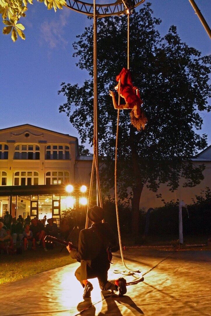 Franco und Lolla sind klassische Charaktere, zeitlos, als wären sie einem Schwarz-Weiß-Krimi entsprungen. Lolla ist cool, rot, gefährlich und so teuer wie ein Sportwagen. Sie ist bereit, zu rennen, zu springen, sich zu drehen und zu tanzen, um sich in dein Herz und vielleicht auch auf dein Herz zu setzen. Franco ist ein cooler Musiker mit einer rauchigen Whiskey-Stimme und der dazu passenden Einstellung. Er trinkt ein bisschen zu viel, aber das ist angesichts seines Liebeslebens zu erwarten. Sie treffen sich in einer traumähnlichen Erinnerung, in der er sie buchstäblich in die Existenz singt. Mit Hilfe des einzigartigen Apparats Counterweight Rope drehen, verheddern, fliegen und springen Franco und Lolla durch die Luft in einer phantastischen, schelmischen Liebesaffäre. Ihre Welt ist die der Anti-Schwerkraft, und als sie den Spieß umdreht, ist klar, dass er seinen Meister gefunden hat. Sie drehen und winden sich in einem Tanz der Ekstase, fliegen durch den Raum und streben mühelos in den Himmel. Sie sind sinnlich, überraschend und verführerisch, wahrlich etwas zum Anschauen.