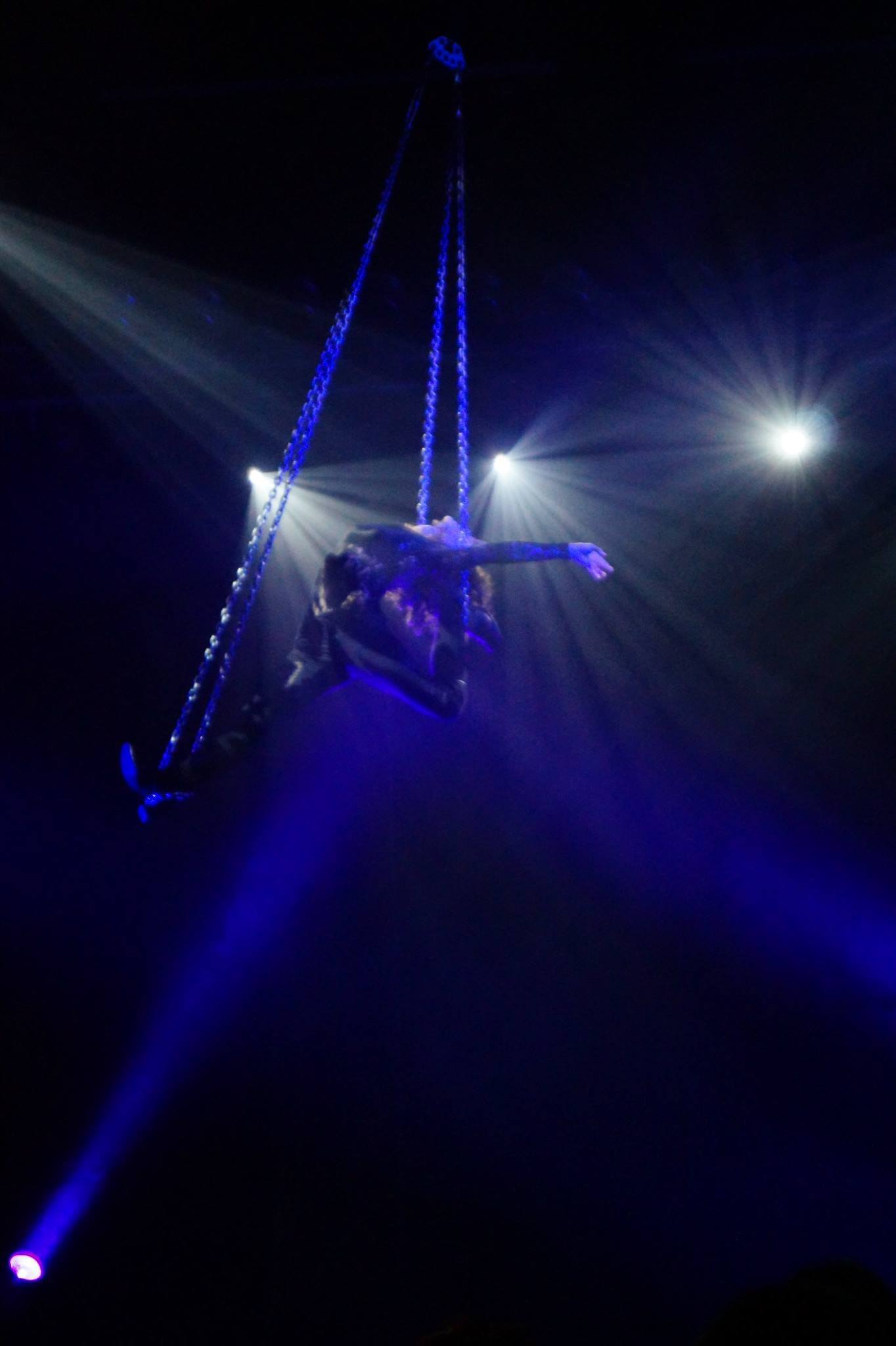 A strong image, hard, cold chains, twirling through space with monumental strength, juxtaposed with a small delicate woman who manipulates them with exquisite precision. They are a stormy partner in her elegant dance. This emotionally charged experience will surprise and seduce with quick flashes of explosive dynamism, which will leave your head spinning and hypnotize you with gentle, fluid solace.