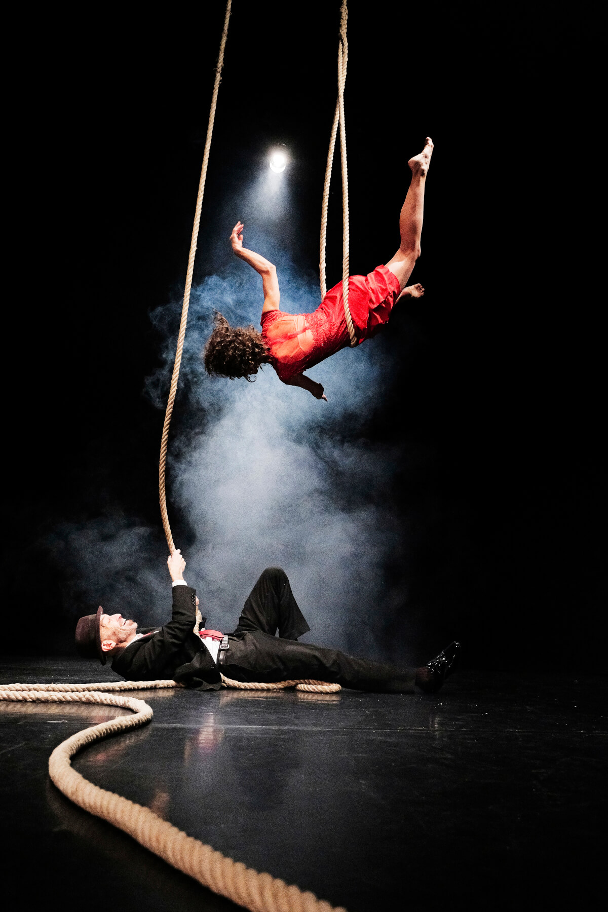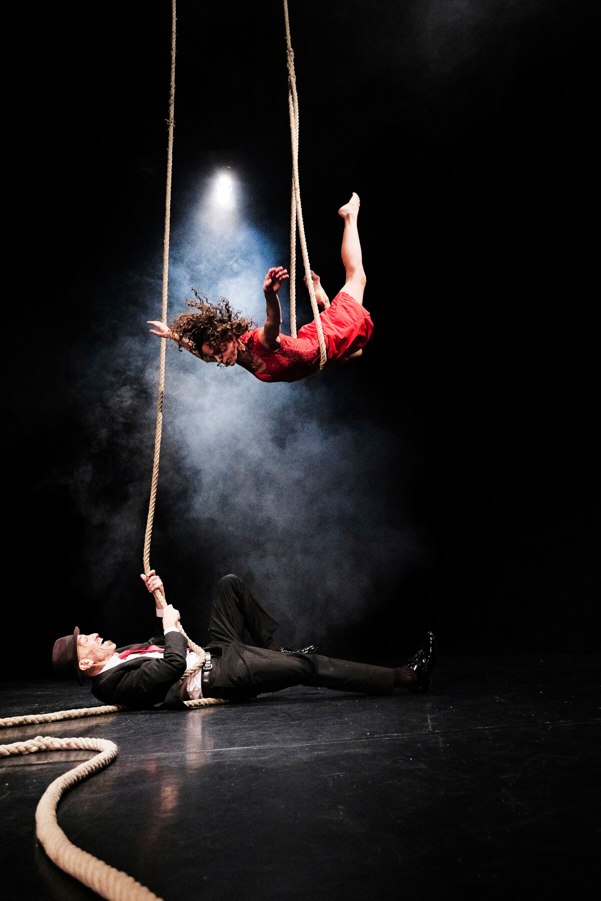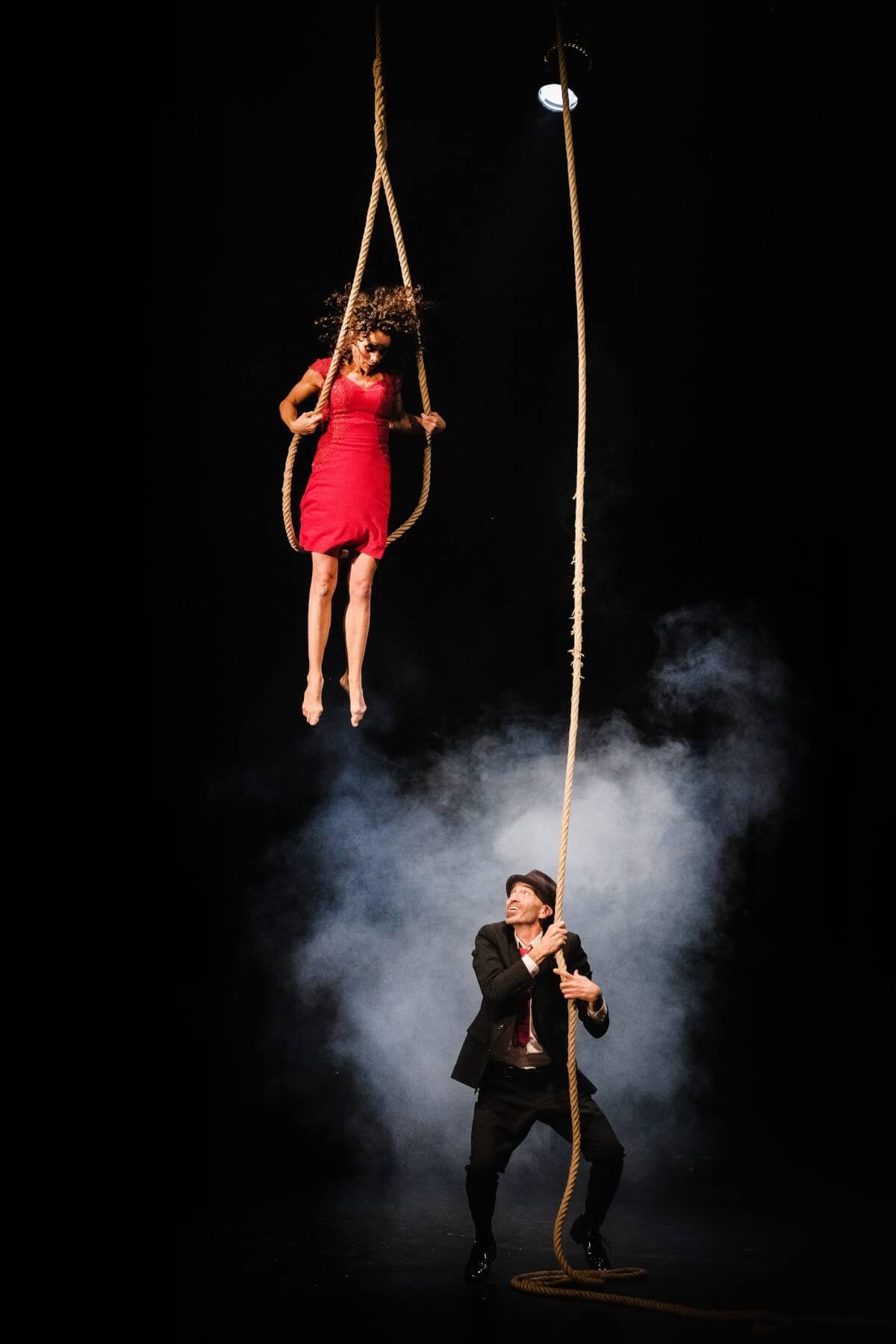 Franco und Lolla sind klassische Charaktere, zeitlos, als wären sie einem Schwarz-Weiß-Krimi entsprungen. Lolla ist cool, rot, gefährlich und so teuer wie ein Sportwagen. Sie ist bereit, zu rennen, zu springen, sich zu drehen und zu tanzen, um sich in dein Herz und vielleicht auch auf dein Herz zu setzen. Franco ist ein cooler Musiker mit einer rauchigen Whiskey-Stimme und der dazu passenden Einstellung. Er trinkt ein bisschen zu viel, aber das ist angesichts seines Liebeslebens zu erwarten. Sie treffen sich in einer traumähnlichen Erinnerung, in der er sie buchstäblich in die Existenz singt. Mit Hilfe des einzigartigen Apparats Counterweight Rope drehen, verheddern, fliegen und springen Franco und Lolla durch die Luft in einer phantastischen, schelmischen Liebesaffäre. Ihre Welt ist die der Anti-Schwerkraft, und als sie den Spieß umdreht, ist klar, dass er seinen Meister gefunden hat. Sie drehen und winden sich in einem Tanz der Ekstase, fliegen durch den Raum und streben mühelos in den Himmel. Sie sind sinnlich, überraschend und verführerisch, wahrlich etwas zum Anschauen.