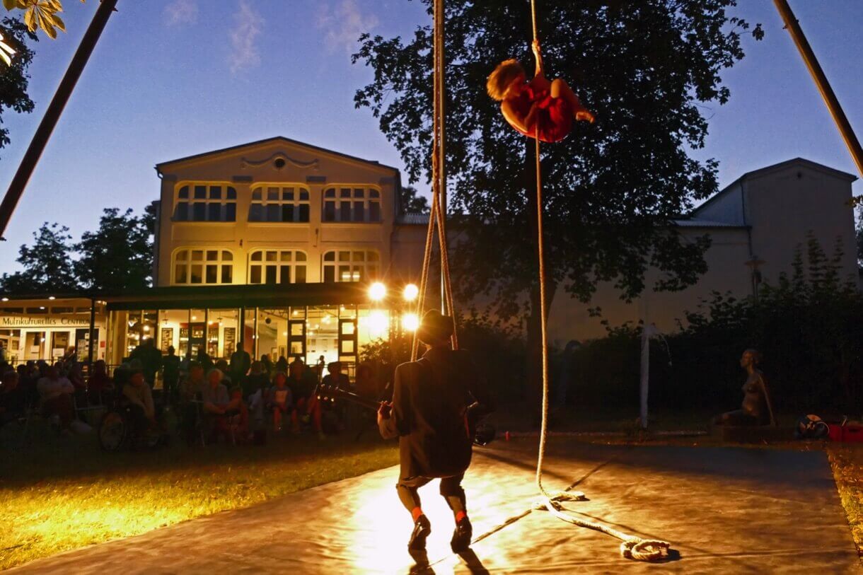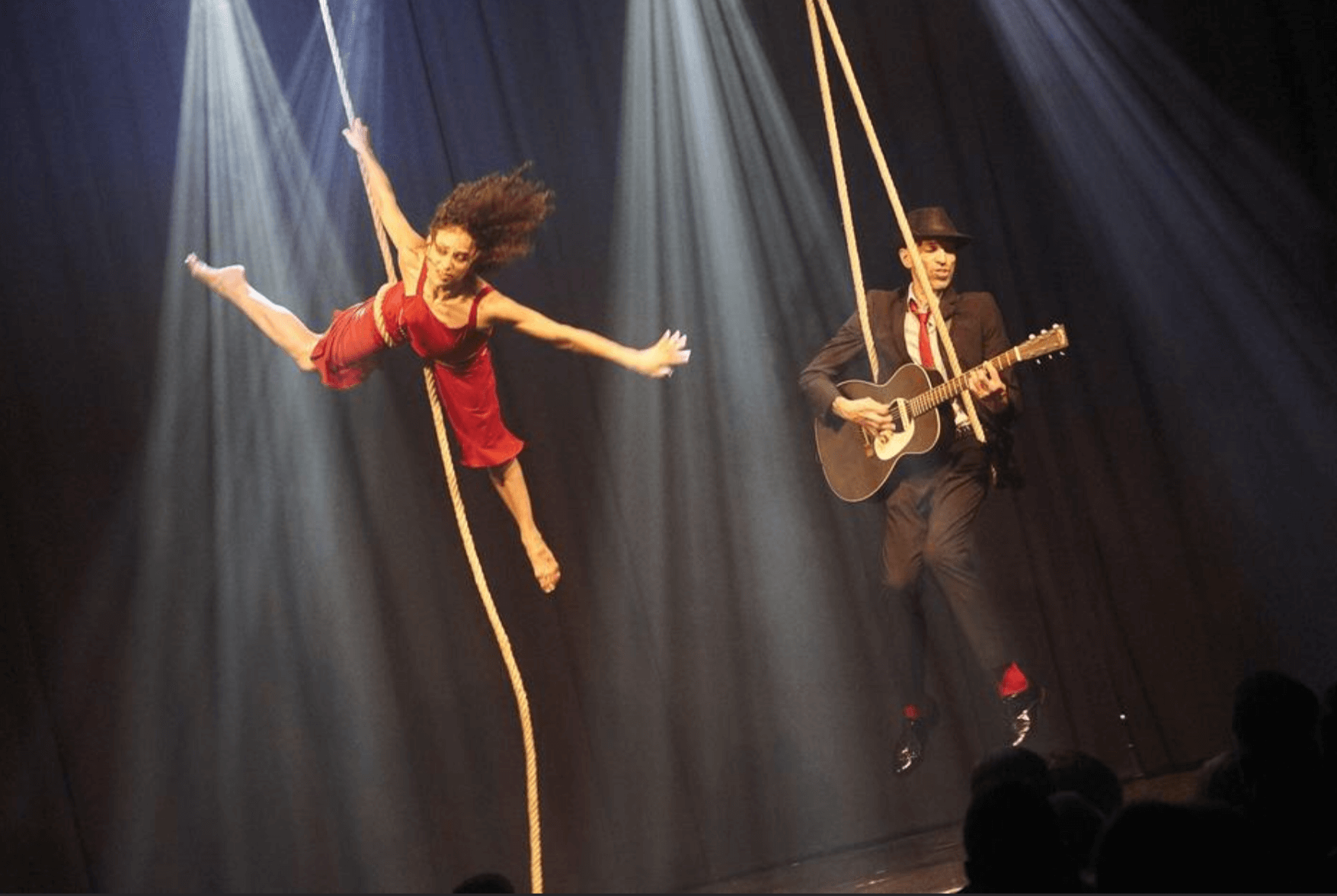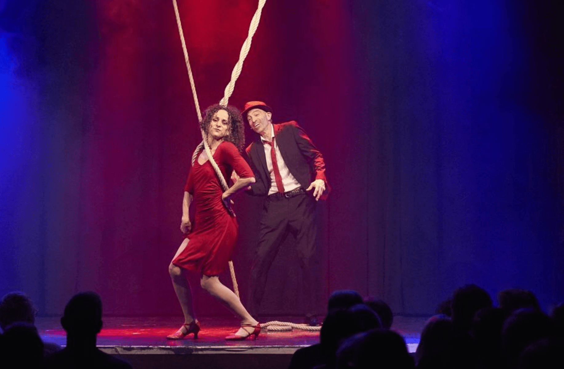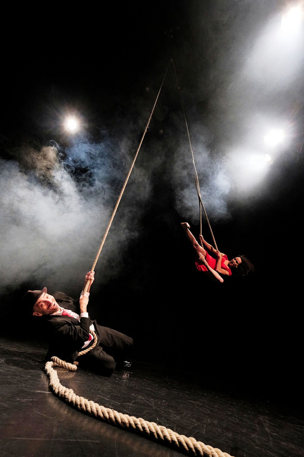 Franco und Lolla sind klassische Charaktere, zeitlos, als wären sie einem Schwarz-Weiß-Krimi entsprungen. Lolla ist cool, rot, gefährlich und so teuer wie ein Sportwagen. Sie ist bereit, zu rennen, zu springen, sich zu drehen und zu tanzen, um sich in dein Herz und vielleicht auch auf dein Herz zu setzen. Franco ist ein cooler Musiker mit einer rauchigen Whiskey-Stimme und der dazu passenden Einstellung. Er trinkt ein bisschen zu viel, aber das ist angesichts seines Liebeslebens zu erwarten. Sie treffen sich in einer traumähnlichen Erinnerung, in der er sie buchstäblich in die Existenz singt. Mit Hilfe des einzigartigen Apparats Counterweight Rope drehen, verheddern, fliegen und springen Franco und Lolla durch die Luft in einer phantastischen, schelmischen Liebesaffäre. Ihre Welt ist die der Anti-Schwerkraft, und als sie den Spieß umdreht, ist klar, dass er seinen Meister gefunden hat. Sie drehen und winden sich in einem Tanz der Ekstase, fliegen durch den Raum und streben mühelos in den Himmel. Sie sind sinnlich, überraschend und verführerisch, wahrlich etwas zum Anschauen.